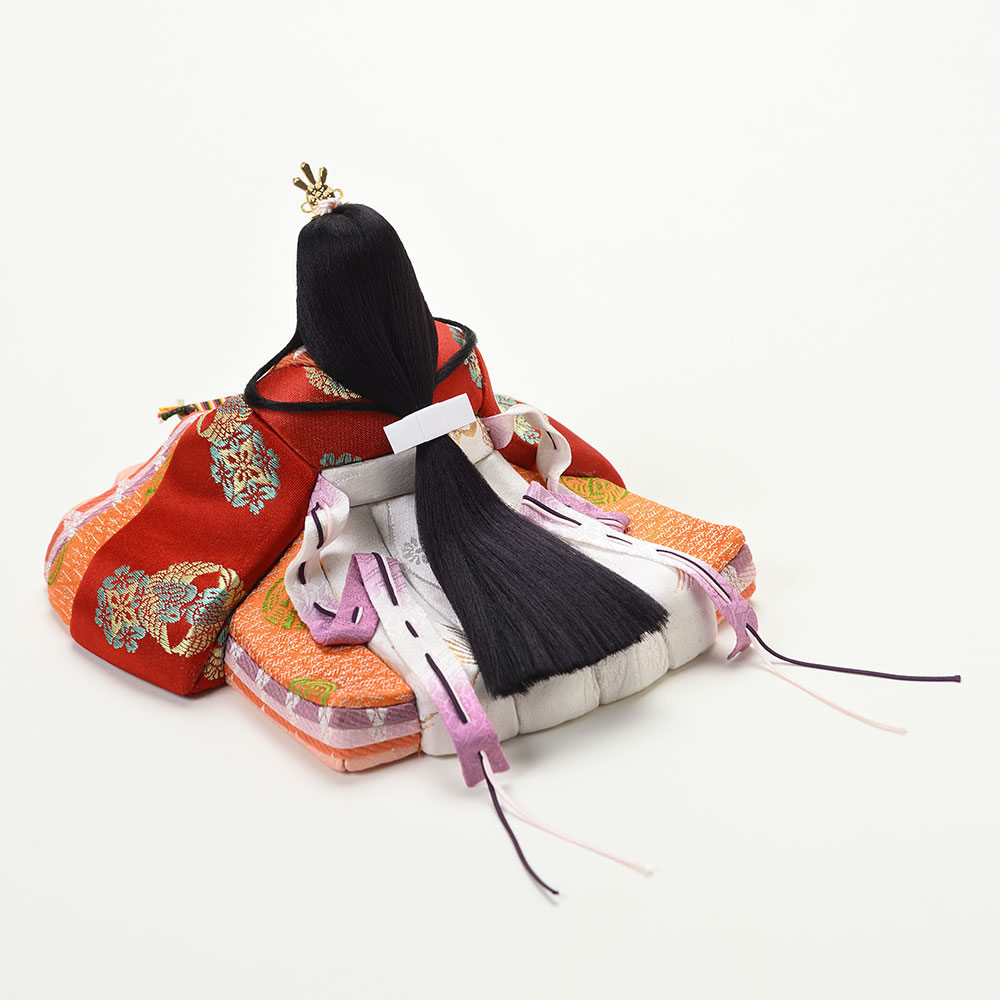男雛に合わせ、女雛も伝統的な十二単を纏っています。十二単の袖のたるみまで表現できるのは、高度な技術を持つからこそ。
