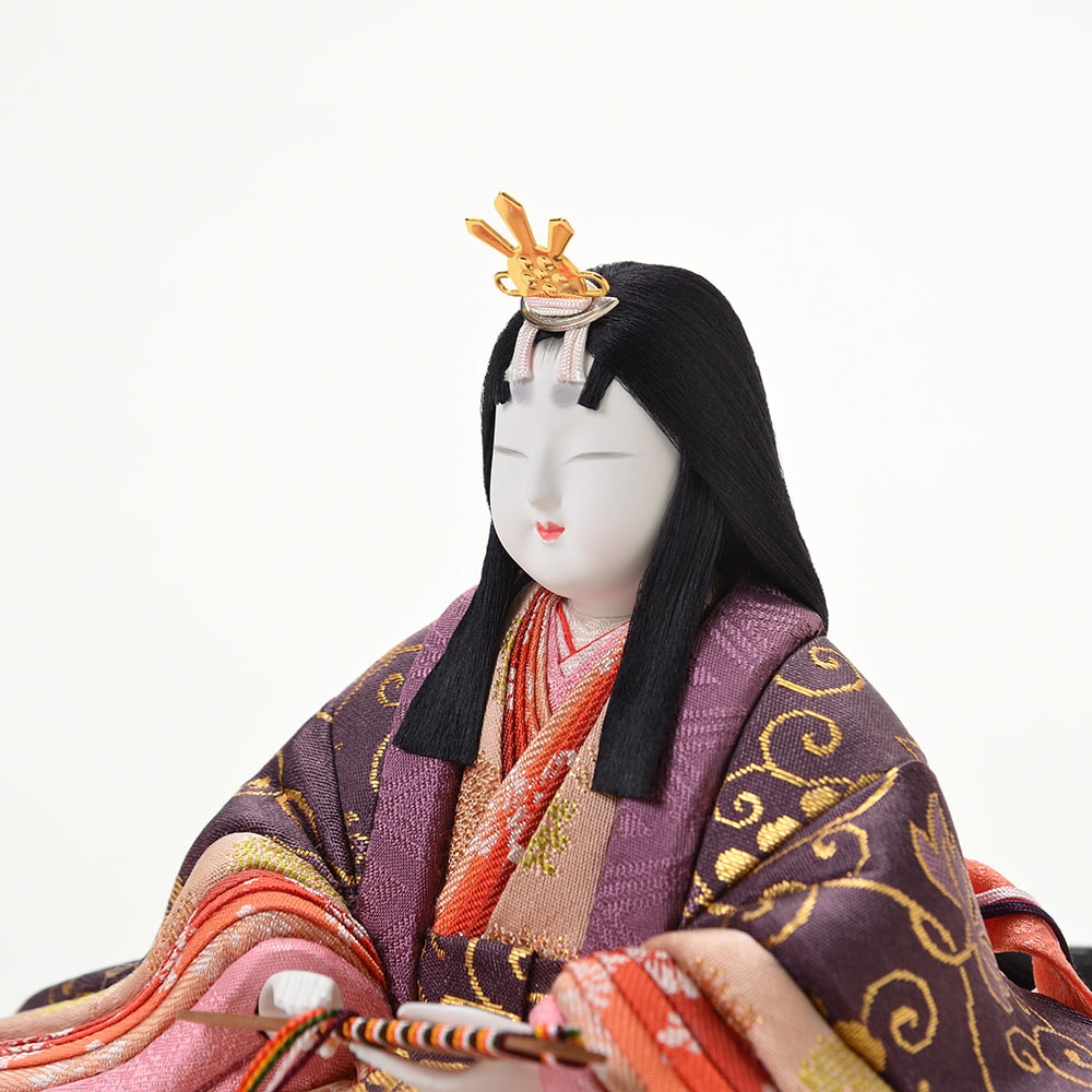衣裳生地の上質さはもちろんですが、ゆったりとした立体的な袖のふくらみ、女雛の幾重にも重なる衿元など、細部まで趣向を凝らした作りとなっています。女雛は昔から高貴な色とされてきた紫色の衣裳。美しい金糸の模様が華やかに彩りを添えています。