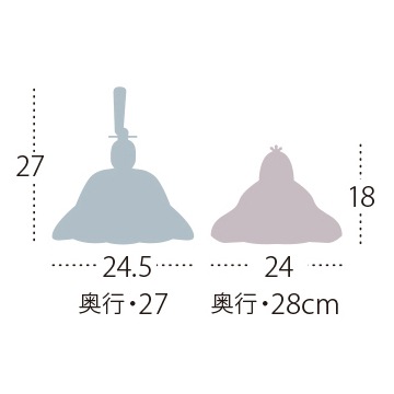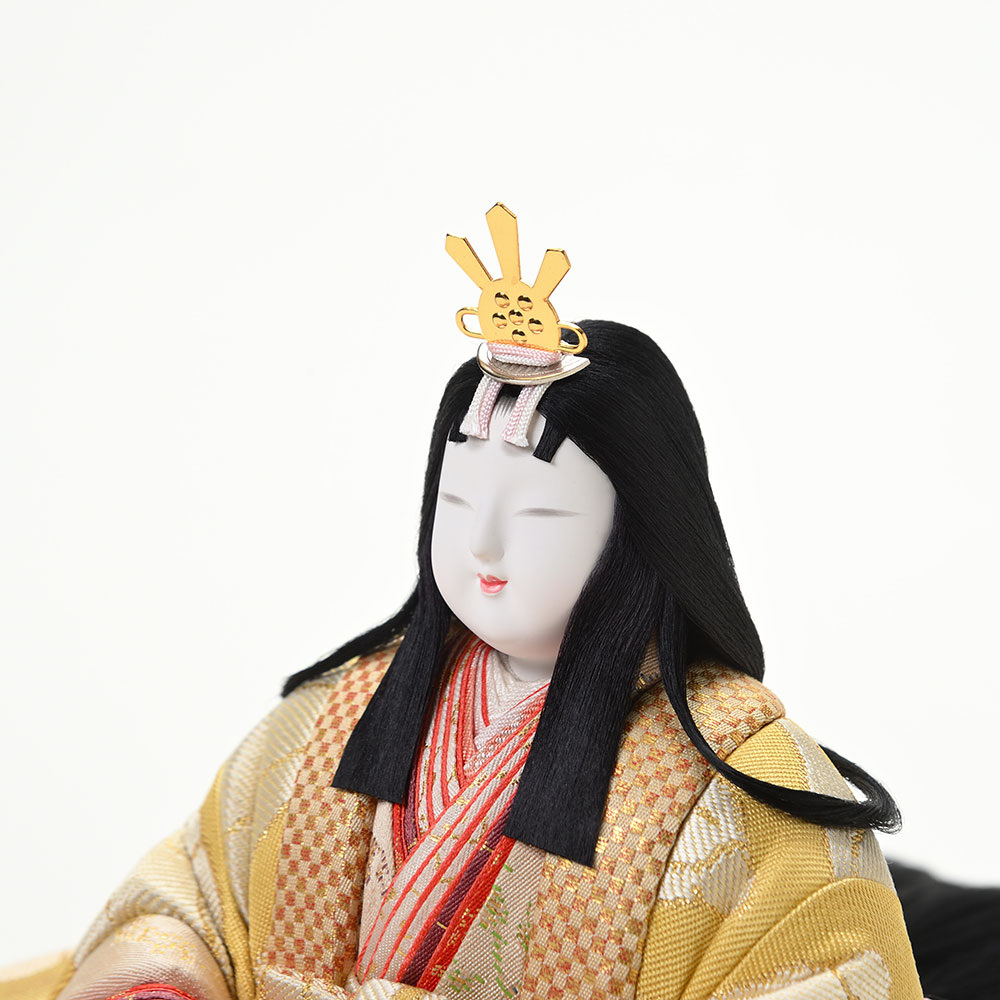 男雛はシックな配色の中に輝く金糸が気品のある華やかさを演出する衣裳を身にまとっています。一方、女雛は優しい色調に本金独特の上質な輝きがあり、その豪華な衣裳を一層華やかに引き立てています。