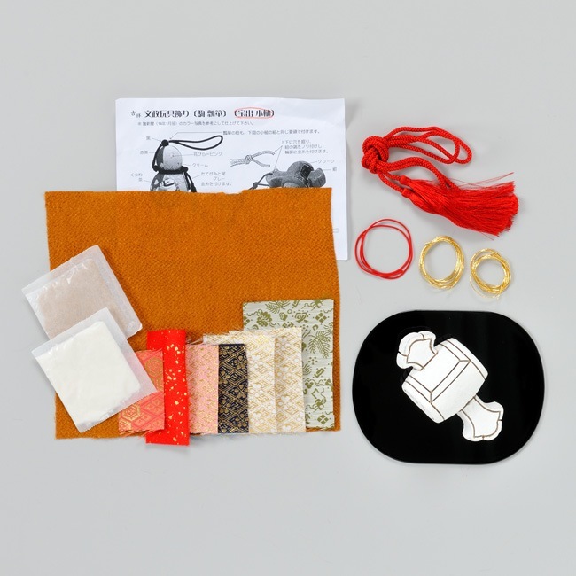 落ち着いた色合いに、金糸がアクセントになって豪華な印象です。小槌と同じくらいの長さがある赤い飾り紐が、キットを華やかに演出。