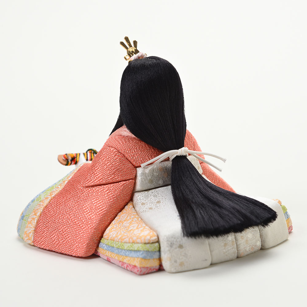 しっとりと輝く、明るい彩りの正絹衣裳。コンパクトサイズの定番親王飾り。