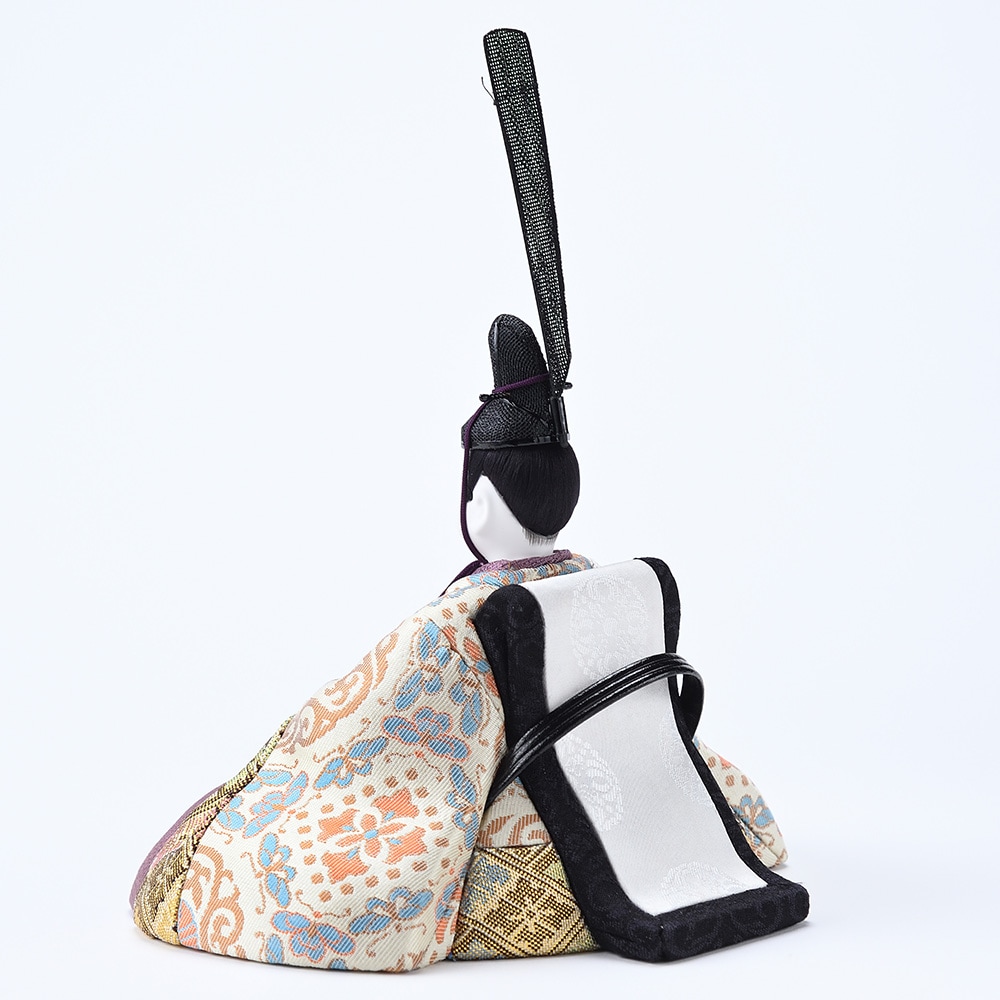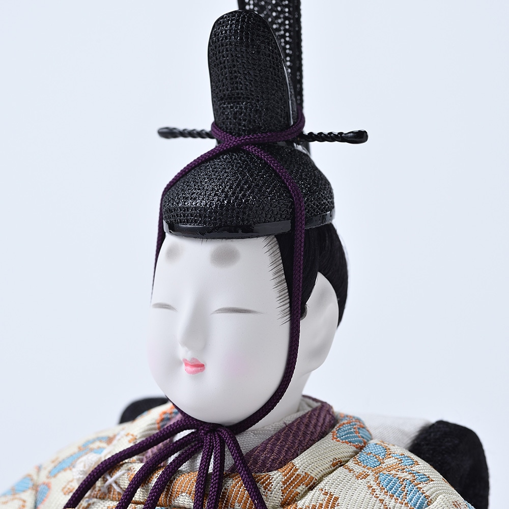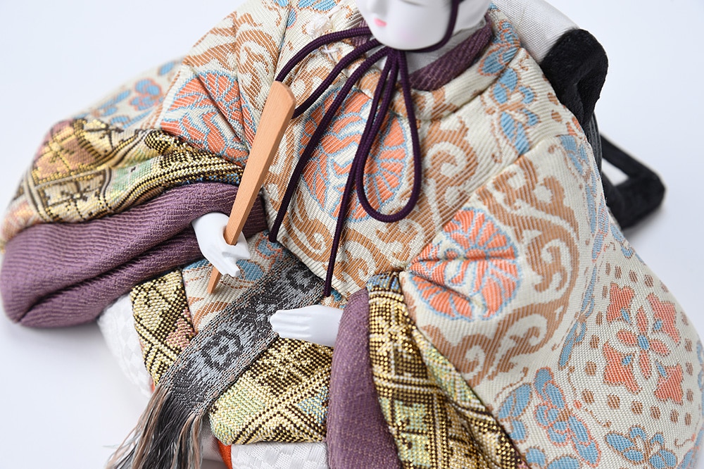 優しく微笑むような表情が印象的なお人形に、希少性の高い手織りの本金佐賀錦の衣裳を合わせ、古の平安王朝の雅を演出する親王飾りです。