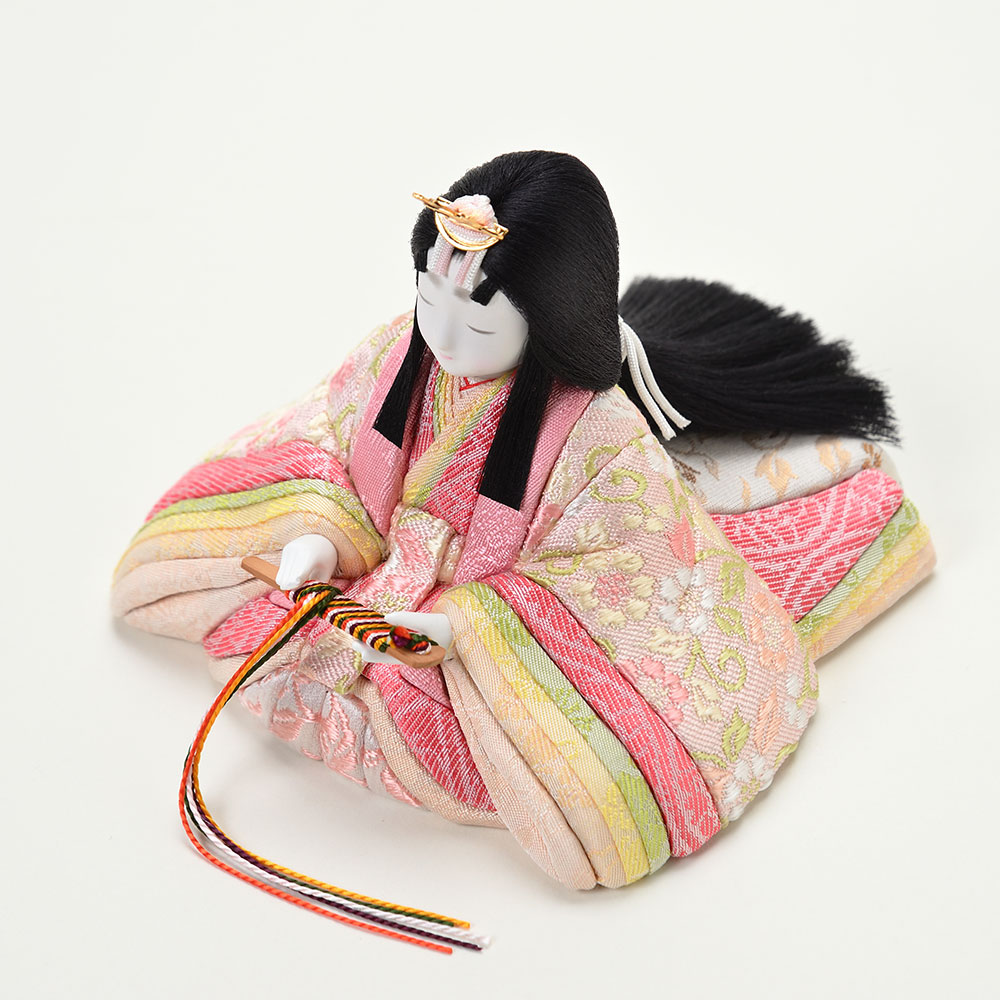 正絹で織られた明るい彩りの衣裳を身にまとう、気品溢れる親王飾りです。