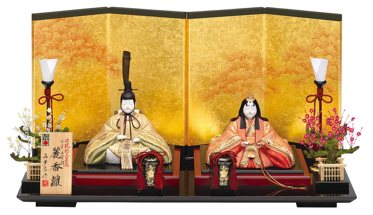 一段目 女雛、男雛、屏風、燭台×2、貝桶×2、親王台×2、紅白梅、作札