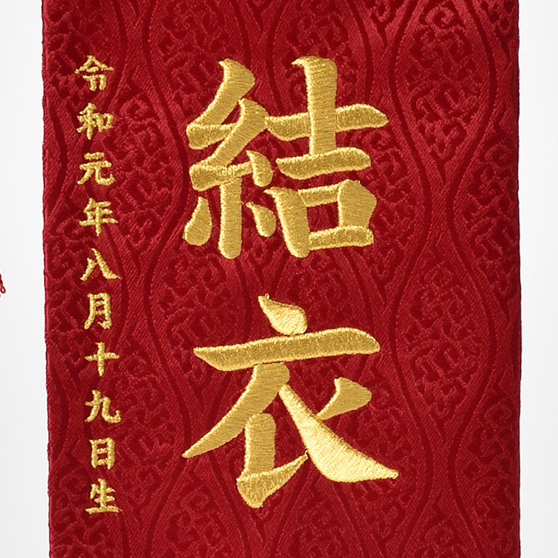 一点一点、大切なお子様のお名前と生年月日を書き順通りに刺繍いたします。まるで習字が浮き上がるような立体感には、お子様の幸せをたぐり寄せる力強さがあります。