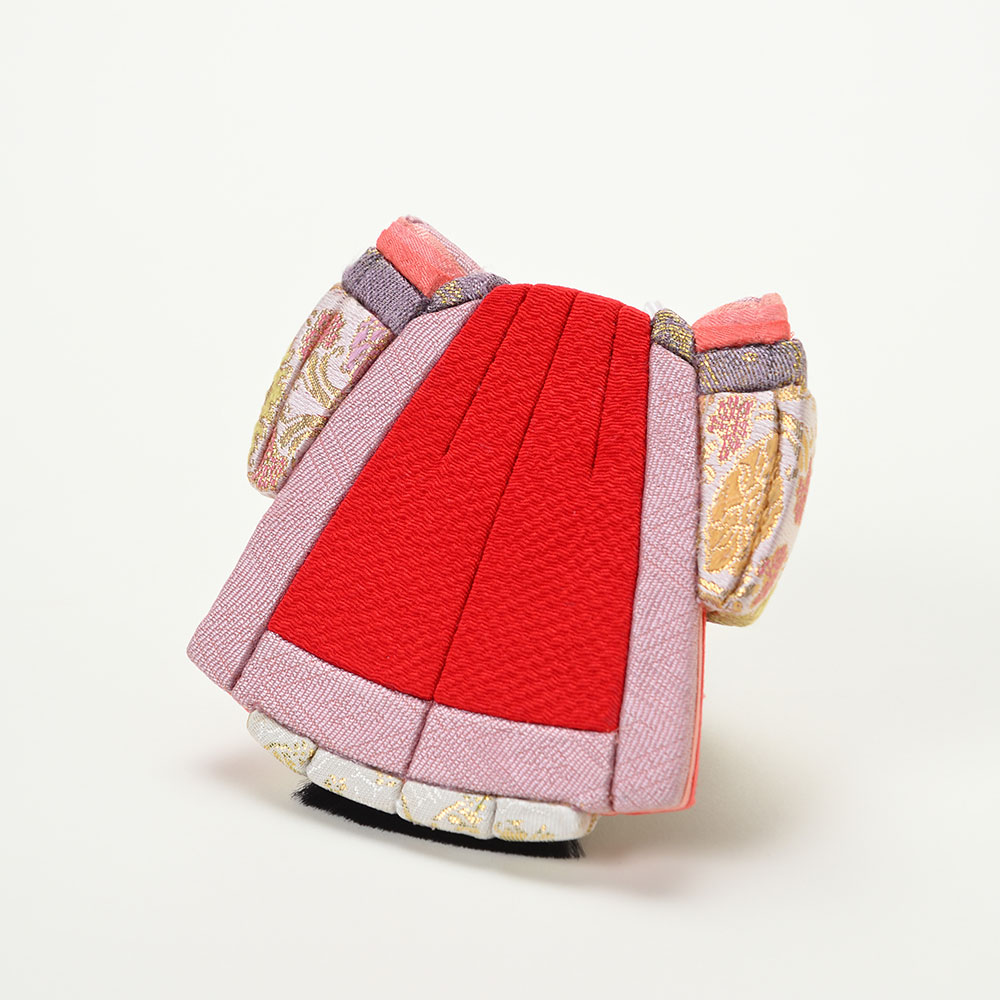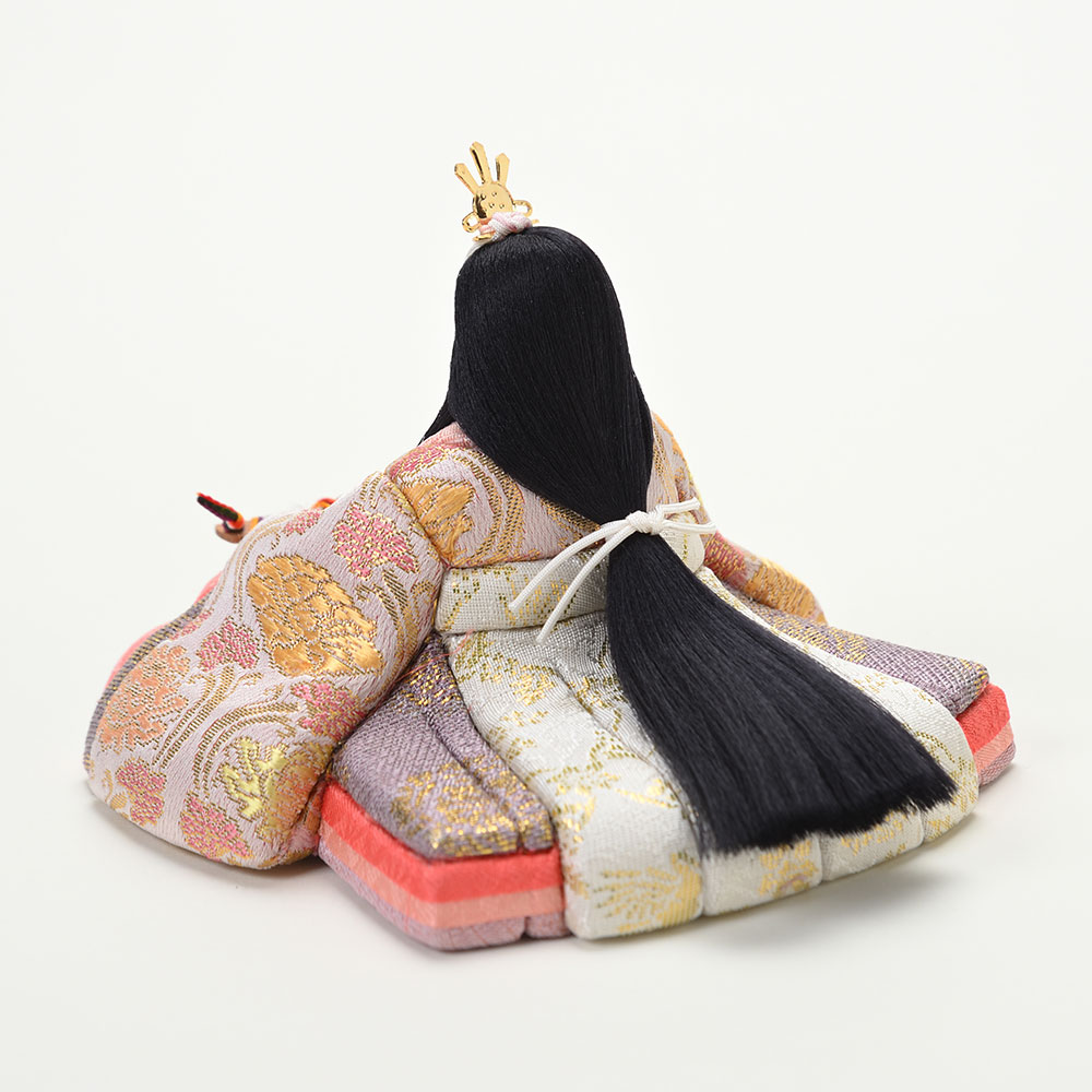 男雛の衣裳には金を用いた図案を配しました。女雛の衣裳も同じく金を用いた図案で、両者とも落ち着きの中に煌びやかな気品を漂わせています。コンパクトながらも袖のふくらみやシワの加減、女雛の衿元の重ね等、細部にまでこだわった仕上がりです。
