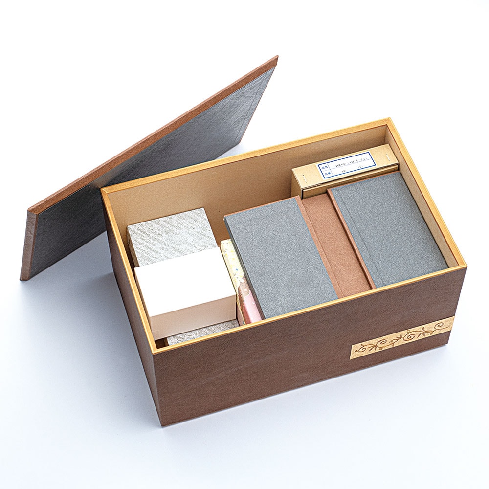 落ち着いた色に金の模様がアクセントを奏で、よりモダンで上品な印象を与えてくれます。和室はもちろん、洋室に飾っても映えるセットです。節句が終わって雛人形をしまってからも、箱のままお部屋に置いてインテリアとしてお楽しみいただけます。