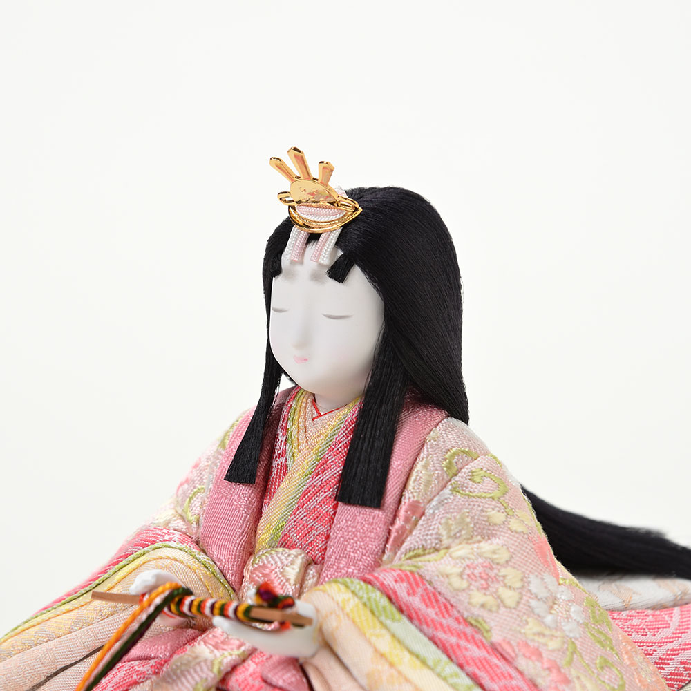 正絹で織られた明るい彩りの衣裳を身にまとう、気品溢れる親王飾りです。
